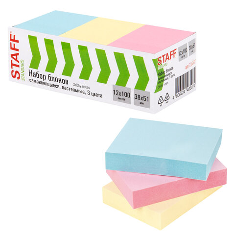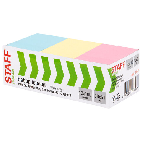 Блоки самоклеящиеся (стикеры) STAFF STANDARD, 38х51 мм, 3 цвета, 100 листов, НАБОР 12 штук, 116587