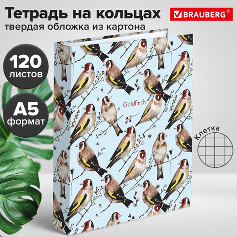 Тетрадь на кольцах А5 (175х215 мм), 120 листов, твердый картон, клетка, BRAUBERG, Щеглы, 404079