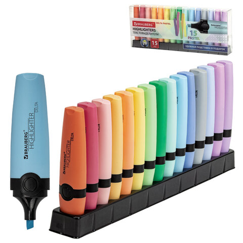Набор текстовыделителей 15 ПАСТЕЛЬНЫХ ЦВЕТОВ на подставке, BRAUBERG "DELTA PASTEL", линия 1-5 мм, 152507