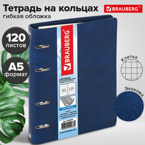 Тетрадь на кольцах А5 (180х220 мм), 120 листов, под кожу, клетка, BRAUBERG "Main", синий, 402005
