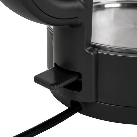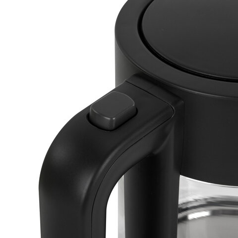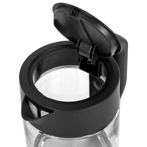 Мощность прибора составляет 2200 Вт, что позволит воде закипеть за считаные минуты. На ручке чайника находится кнопка открывания, что делает удобнее его эксплуатацию. Корпус изготовлен из термостойкого стекла. Скрытый нагревательный элемент увеличит срок службы. Индикатор уровня воды позволит с легкостью определить количество воды в чайнике.