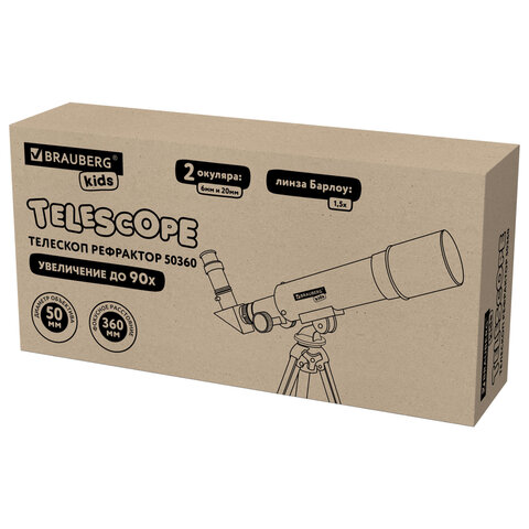 Телескоп рефрактор астрономический настольный, увеличение 90х, объектив 50 мм, фокус 360 мм, видоискатель, 50360, BRAUBERG KIDS, 391396