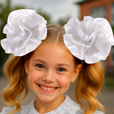 Два белых банта на резинке – универсальный аксессуар для праздников и повседневности. Объемный диаметр (17 см) добавляет образу легкость, а мягкая резинка не травмирует волосы.